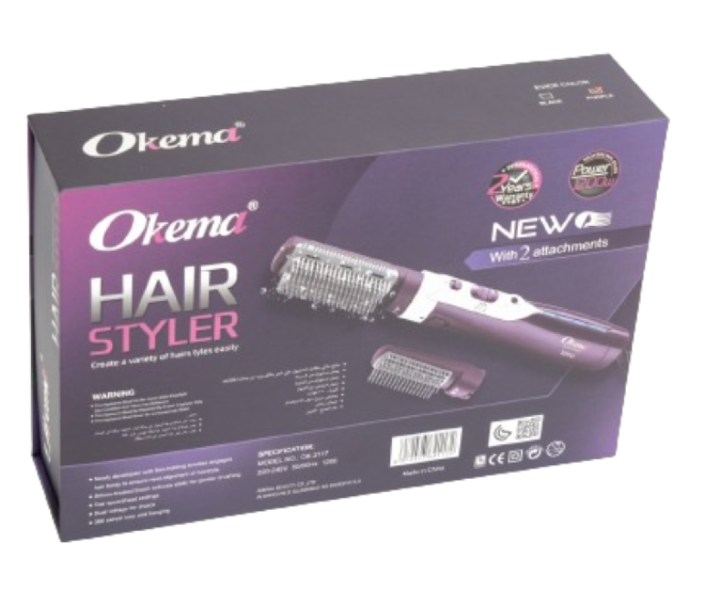 تم تصميم طقم تصفيف الشعر OK-2117 من اوكيما ليعمل على تسريح الشعر وتنعيمه بطريقة احترافية ويمكنك من لف وتمويج الشعر بشكل متألق بتصميم أنيق مع مقبض مريح وسهل الاستخدام انه جهاز مثالي متكامل للحصول على شعر متألق يزيد من جمال إطلالتك