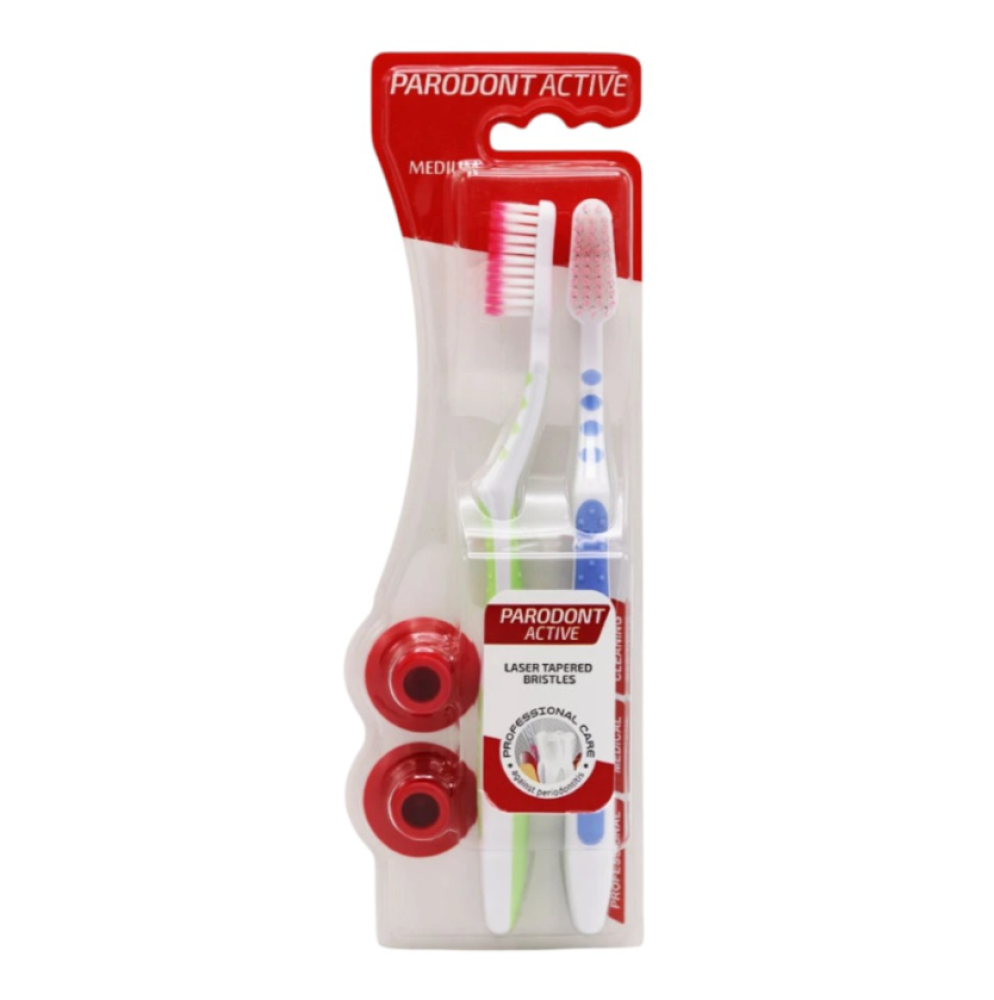 فرشاتا بارودونت أكتيف متوسطة الشعيرات (عبوة مزدوجة، ألوان عشوائية) تتميز بشعيرات مائلة لإزالة البلاك الفعالة وتحفيز اللثة. الشعيرات المتوسطة النعومة تنظف بلطف مع حماية المينا—مثالية للعناية اليومية بالفم.