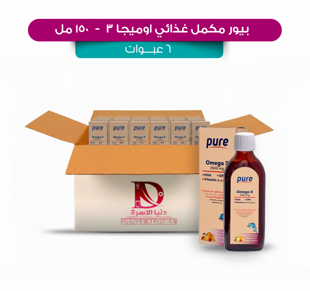 شراب 150 مل اوميجا 1500 مجم يحتوي علي 1250 دي اتش ايه و 250 مجم أي بي ايه و فيتامين بى كومبلكسعلاج للأطفال في حالات فرط الحركة والتوحد ومشاكل القلب والأزمة الصدرية والوزن وبناء الجسم5 مل يوميا