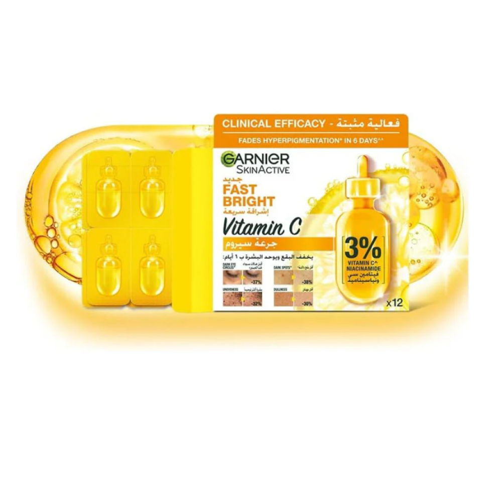 أمبولات غارنييه بتركيز 3٪ فيتامين سي ونياسيناميد بحجم 1.5 مل لكل أمبولة، عددها 12 قطعة،