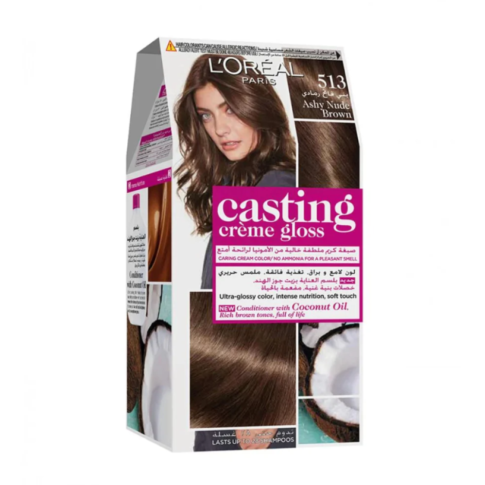 لوريال كاستينج صبغة شعر بني فاتح رمادي 513 تمنحك لونًا غنيًا وطبيعيًا يدوم طويلًا، مع لمعة لؤلؤية تعزز جمال الشعر. تركيبتها تحافظ على صحة الشعر وتمنحه مظهرًا ناعمًا وحيويًا.