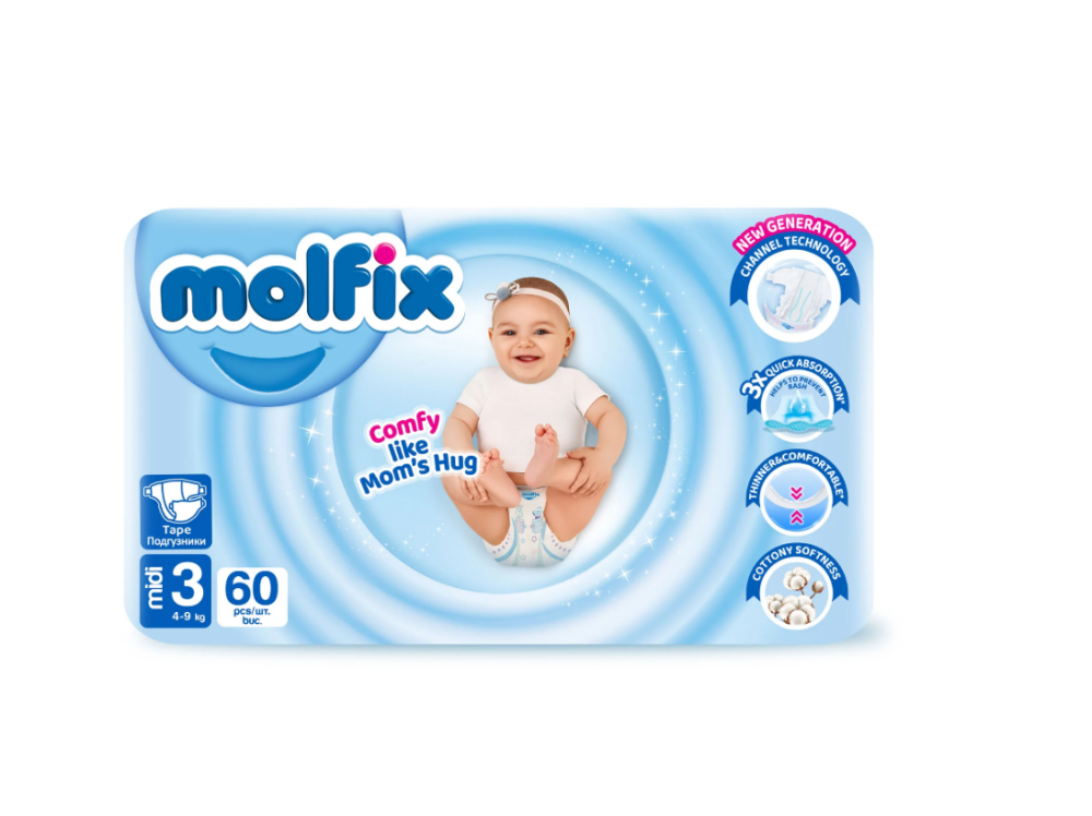 • تم تجديد حفاضات أطفال مولفيكس بجيل جديد من تكنولوجيا قنوات الامتصاص.